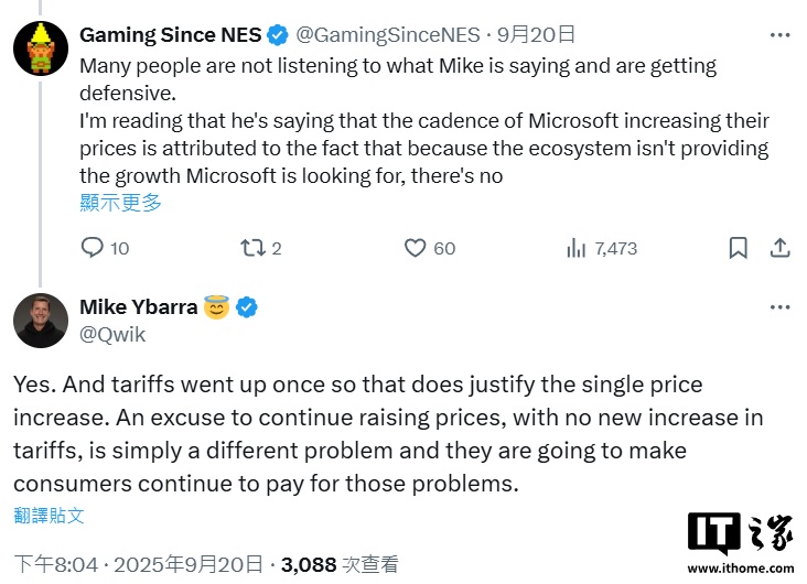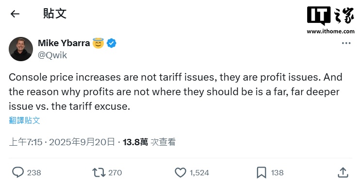 IT之家 9 月 23 日音讯,前暴雪文娱总裁 Mike Ybarra 今天在 X 平台发文,聊及微软 Xbox 游戏机的加价战术。